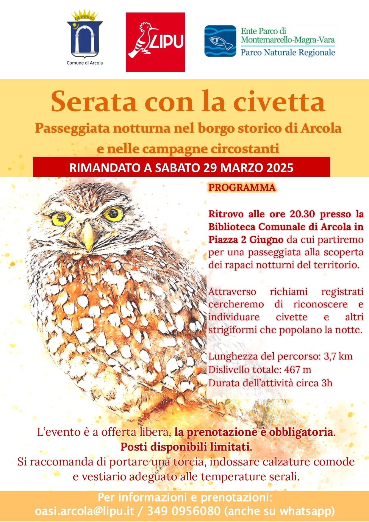 Ritrovo alle ore 20.30 presso la Biblioteca Comunale di Arcola in Piazza 2 Giugno da cui si parte per una passeggiata alla scoperta dei rapaci notturni del territorio.
